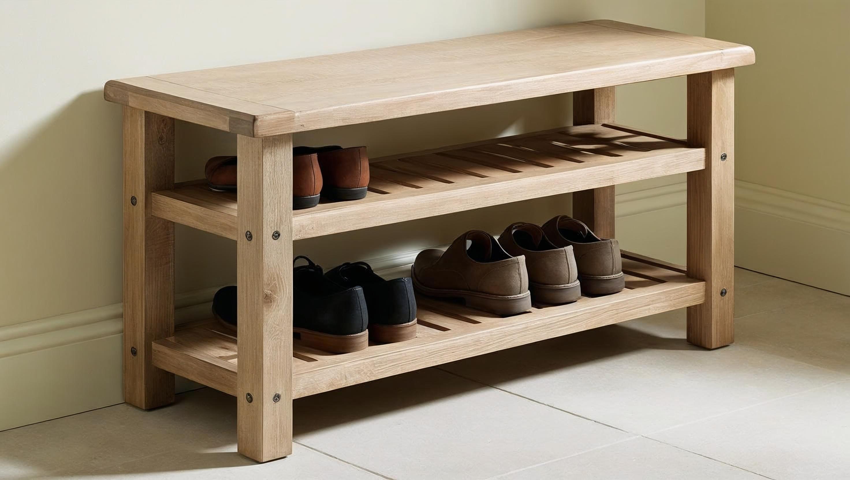 Organize your entryway with this elegant and durable shoe rack bench. Featuring two spacious slatted shelves and a solid top, it's perfect for shoes, boots, and bags. Includes easy-to-follow woodworking plans with diagrams, cut list, and assembly guide. Ideal for beginners and weekend projects.